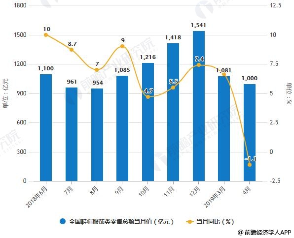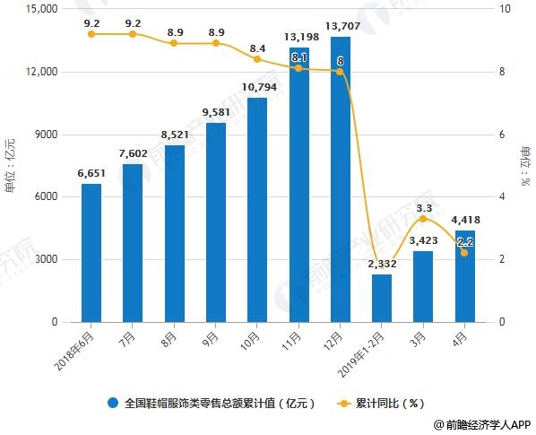 2018-2019年4月全國鞋帽服飾類零售總額統計及增長情況