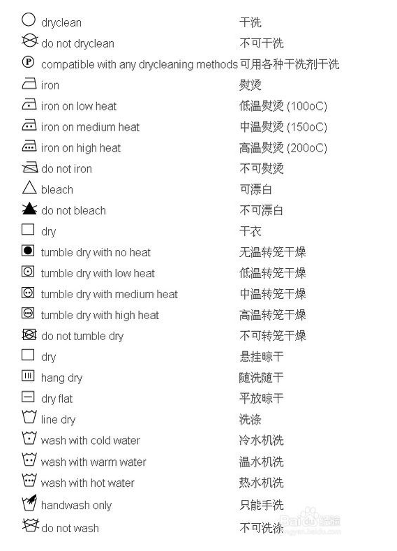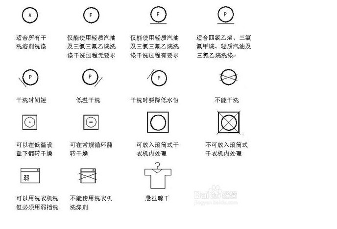 1衣物上的洗滌標識大部分是圖案或者圖案加英文,大部分用戶識別比較困難,下下面小編給大家收集了一些標識翻譯,供大家參考,后面為大家一一講解意思,如下圖所示!