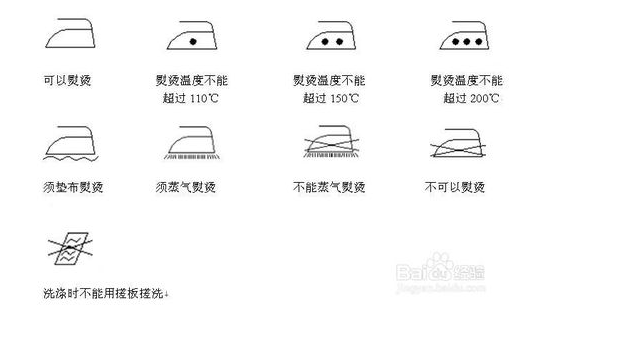 4熨燙標志,最重要的標識,提示操作方式,打叉就是嚴禁的意思。如下圖所示